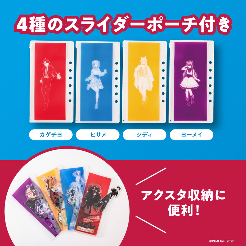 初のアイテム付きブックを記念し、特別衣装を着たカゲチヨ、ヒサメ、シディ、ヨーメイのイラストが描かれたデザインで、グッズをたっぷり収納できます。