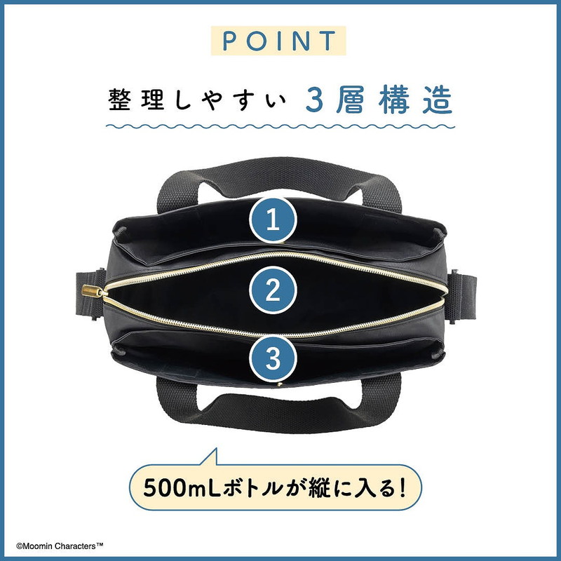 ムーミンから、大きく開いて出し入れラクラク! 軽くて便利な3層ショルダーバッグが登場。