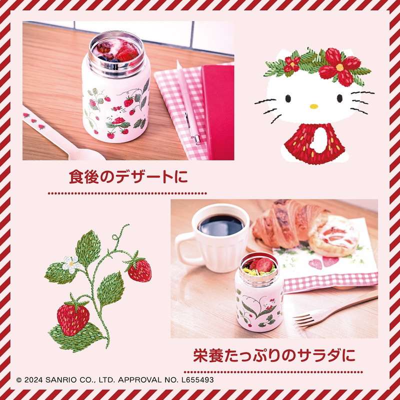 刺繍風デザインのハローキティがぐるっと一周プリントされたスープジャーは、おいしい温度が最大6時間続く優れもの。