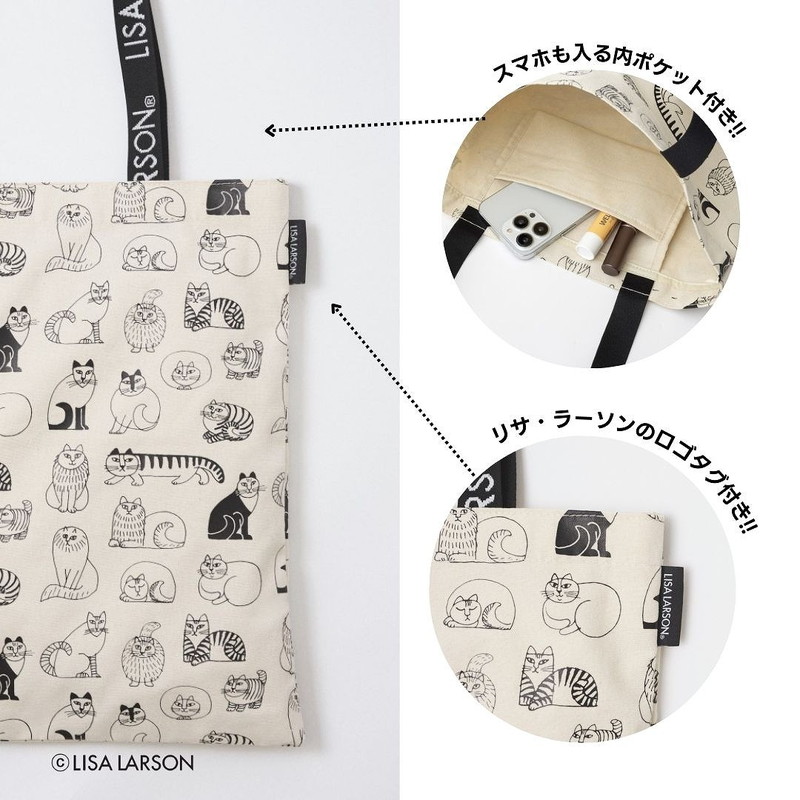 スペシャルアイテムは、リサが描いたさまざまな猫のスケッチを総柄でプリントしたトートバッグ。リサ・ラーソンの作品の中でも人気のモチーフです。内ポケットもついており、毎日のお出かけに重宝するアイテムです。