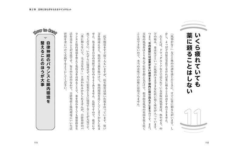 自律神経研究の第一人者である順天堂大学医学部小林弘幸教授が、「行動習慣」「マインドセット」「食事術」「運動&マッサージ」「人間関係で心を休める方法」「休日の過ごし方」に関する「攻めの休息術」67メソッドを一挙紹介。