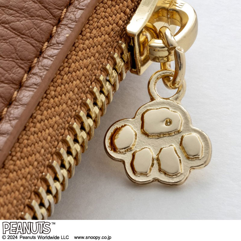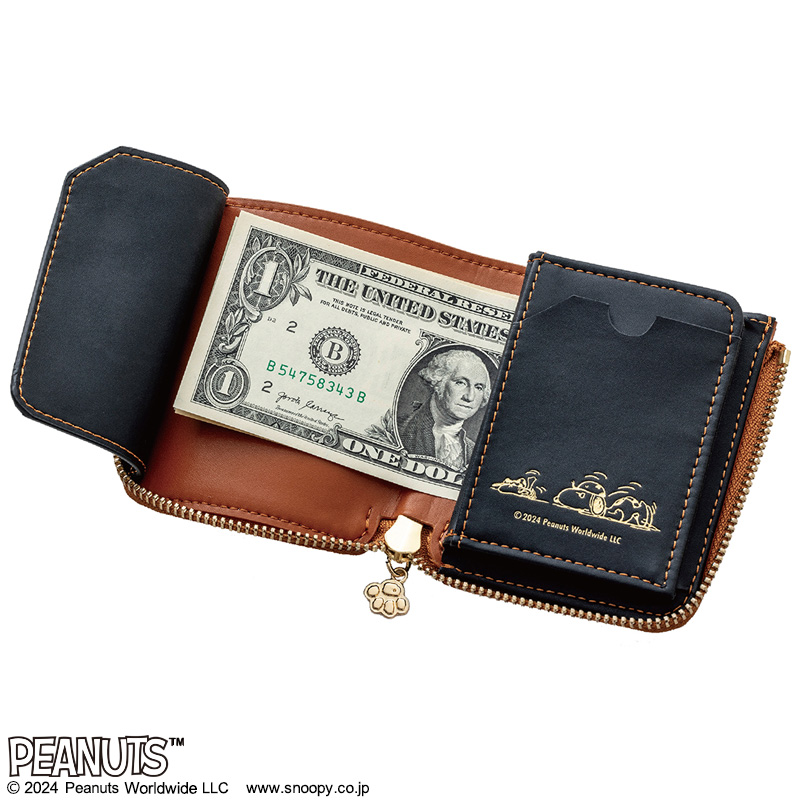 スヌーピーの肉球形のファスナートップがポイント! L字のファスナーを開けると中はブラックの生地を使ったバイカラーのコインケースとカードポケット。