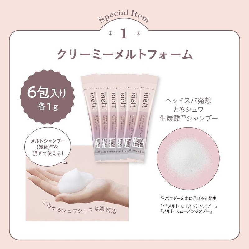 とろふわの濃密泡や、パチパチと泡のはじける音の生炭酸(*1)シャンプーなど、さまざまな感覚に働きかけるmeltのヘアケアで自分を大切にするバスタイムを。
