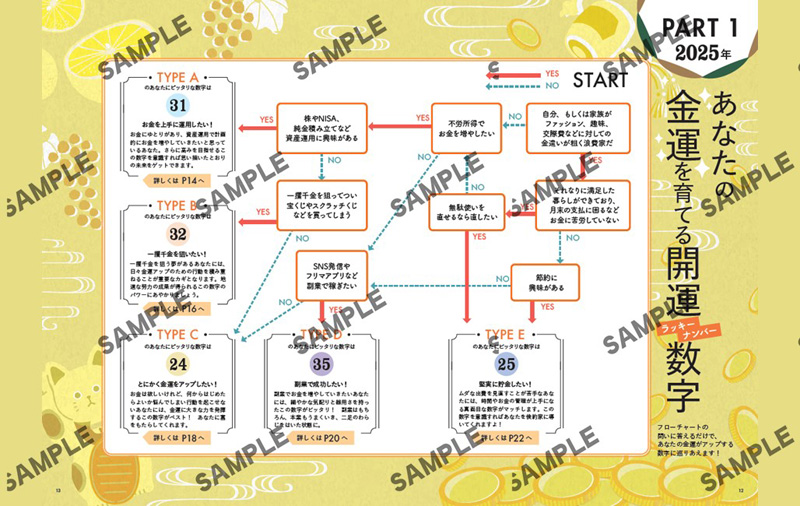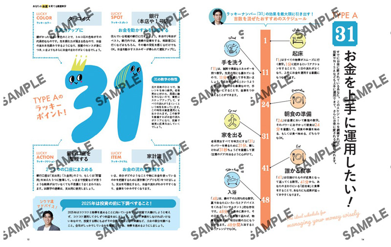 “計画性を持つ”ということを意識すると開運につながる2025年。本誌ではあなたの開運数字を一日のタイムスケジュールに落とし込むだけで運が育つ、シウマ流スケジュール開運術を紹介します。金運・恋愛・仕事・健康の4つの分野にわけて、簡単なフローチャートに答えるだけで開運数字がまるわかり。そして、その開運数字を取り込むだけで開運につながる一日のタイムスケジュールとラッキーポイントを解説します。