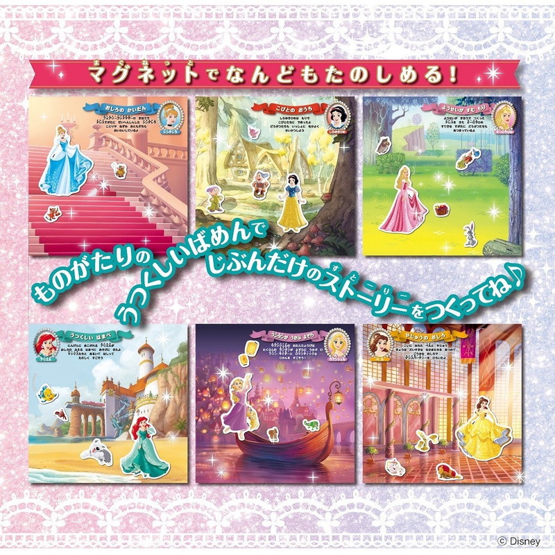 ラプンツェル、ベル、アリエル、シンデレラ、オーロラ姫、白雪姫の6人のディズニープリンセスとその仲間たちが登場するマグネットえほんです。