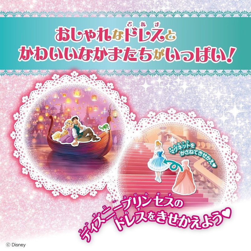 マグネットを貼りつけるボードは、「おしろのかいだん(シンデレラ)」、「ランタンがうかぶよぞら(ラプンツェル)」など、6つの場面で遊べます。