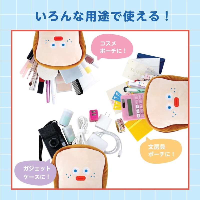 ぬいぐるみのようなふわふわの手触りと、きょとんとしたトーストの表情がかわいいポーチです。