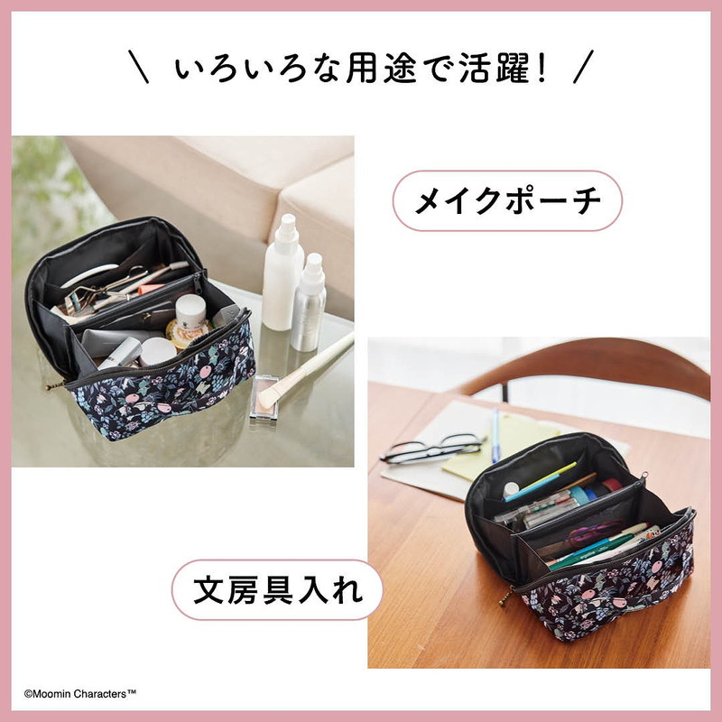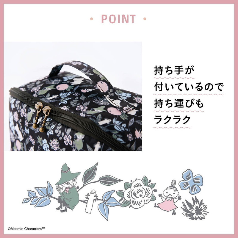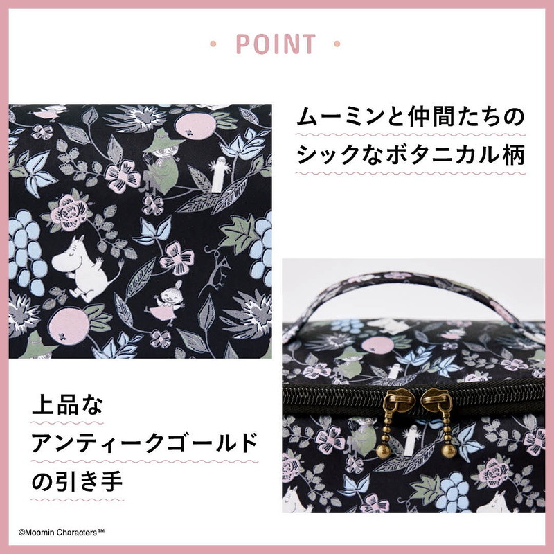 ムーミンデザインがおしゃれな、ガバッと開く便利なポーチが完成しました。上品なブラックの生地に落ち着いたカラーリングで、ムーミンと仲間たちが描かれたシックなボタニカル柄がおしゃれ。