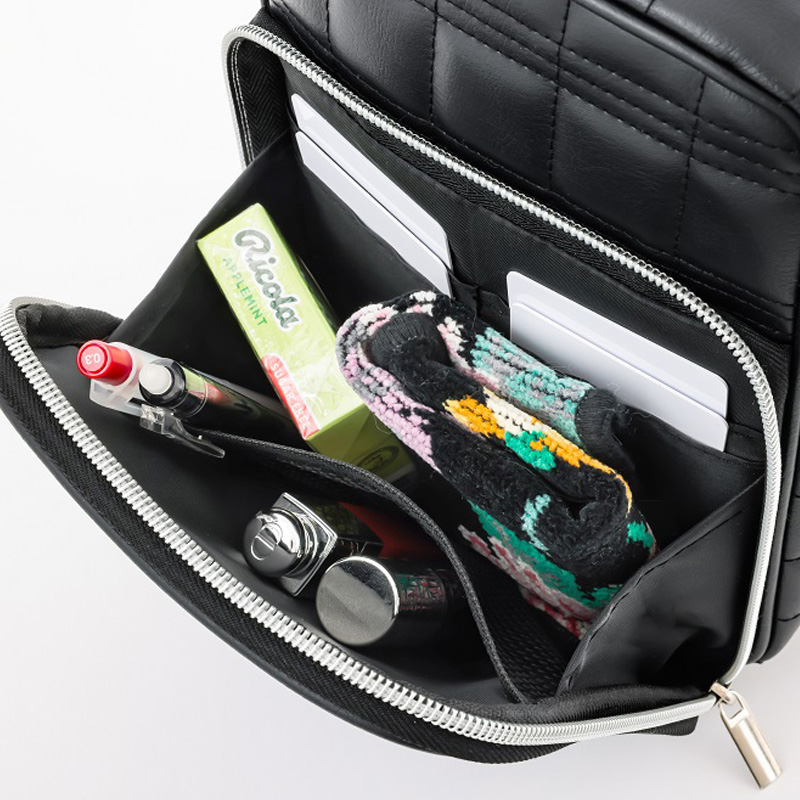 ● 大きく開くフロントポケットはカードポケットやメッシュポケットつきで細かいものも整理しやすい