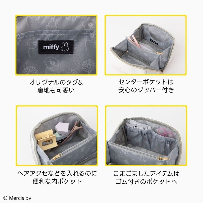 裏地は、ミッフィーとボリスやさまざまな花をちりばめたキュートな総柄を使用。デザインと機能性を兼ね備えた、うれしいボックスポーチです。