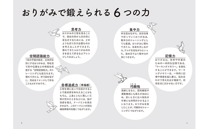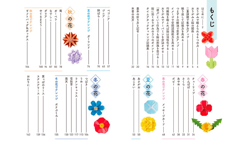 もの忘れや認知症予防にはおりがみが効果的。指先を動かし完成まで取り組む集中力、工程の意味を把握する理解力、角と角を合わせてきっちり折る注意力、出来上がりをイメージし紙や色を選ぶ思考力など、様々な脳の力をトレーニングできます。美しく素敵な作品に定評のある、おりがみ作家のたかはしななさんが考案した、季節を感じられる花のおりがみを誰でも簡単に折れるようになる一冊です。