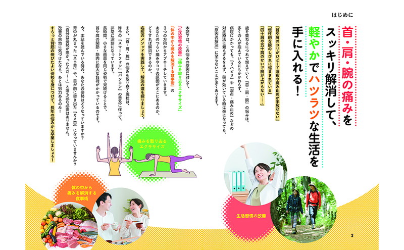 本誌では、鎮痛薬や湿布が手放せない慢性的な首、肩、腕の痛みやしびれを自分で治す方法を「エクササイズ」と「生活術」と「食事」の3方向からわかりやすく解説します。