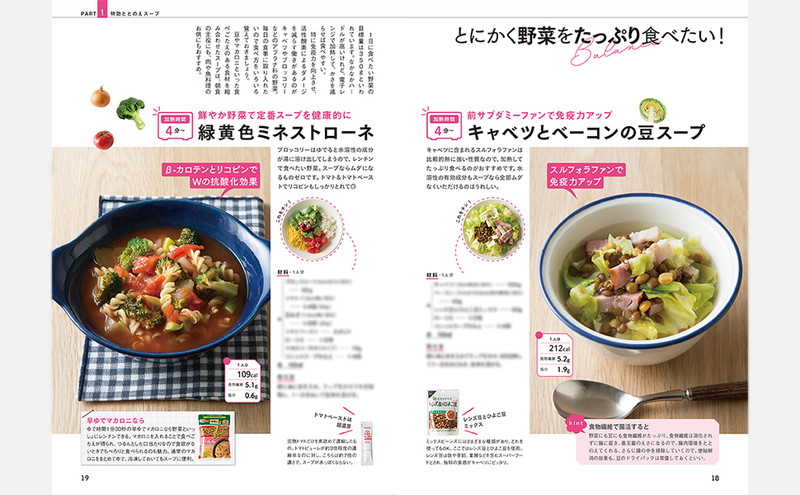 作り方は食材を切ってチンするだけ。調理が億劫になる時季でも毎日飽きずに食べられます。管理栄養士監修なので、栄養バランスもばっちり。食欲不振に効く食材を使ったスープや、肉・野菜のバランスがよく食べ応え満点のごちそうおかずスープ、いつもの献立に追加するだけの一つの野菜スープなど、全85品紹介。