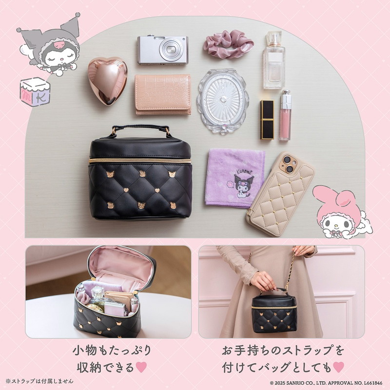 レザー調のキルティング生地が大人っぽく、マイメロディとクロミのゴールドスタッズが高級感たっぷり! 手持ちのストラップを付ければショルダーバッグとしても使えます♪