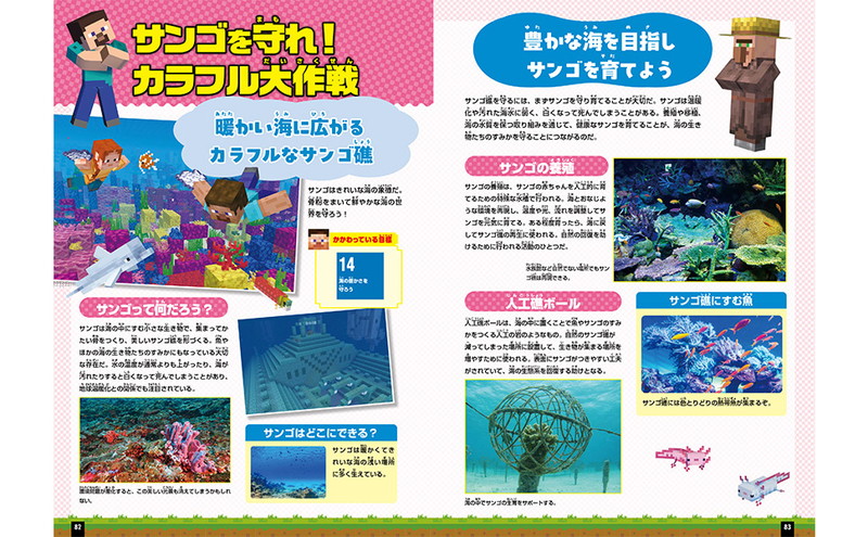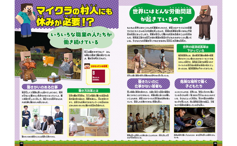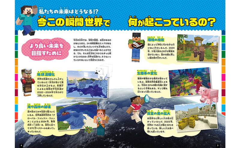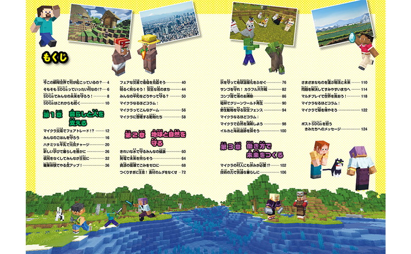 未来を担う子どもたちが考えたい「17の目標」の内容や達成状況、今後の課題、日常生活との関わりなど、マイクラの世界を通してわかりやすく学べます。