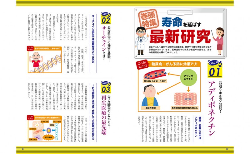 「健康寿命」とは、日常生活を送るうえで健康上の問題がない状態のことで、介護を必要とせず自立して過ごせる期間のことです。厚生労働省の統計によれば、日本人男性は平均で約9年間、女性は平均で約13年間も健康上の問題を抱えて、自立できない状態で老後を過ごしています。本誌は寿命を延ばす最新研究の情報を掲載するとともに、健康寿命を延ばすための食生活や生活習慣の改善方法を多数紹介します。