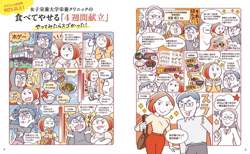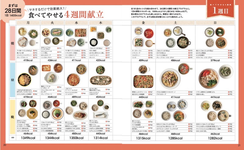 そこで、ダイエット成功率90%以上の女子栄養大学栄養クリニックのノウハウが詰まった「4週間ダイエット献立レシピ集」をお届けします。一日1400kcalの栄養バランスのいいメニューばかりだから、そのままマネするだけでOK! まずは4週間実践してみて。結局、王道こそ近道。ムリなく、おいしく、簡単に作れるレシピで、健康的にやせましょう! 八訂・食品成分表2025対応。