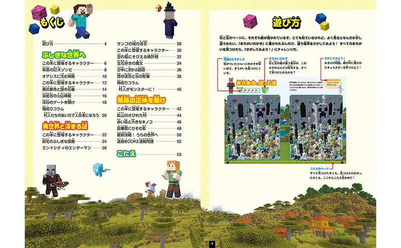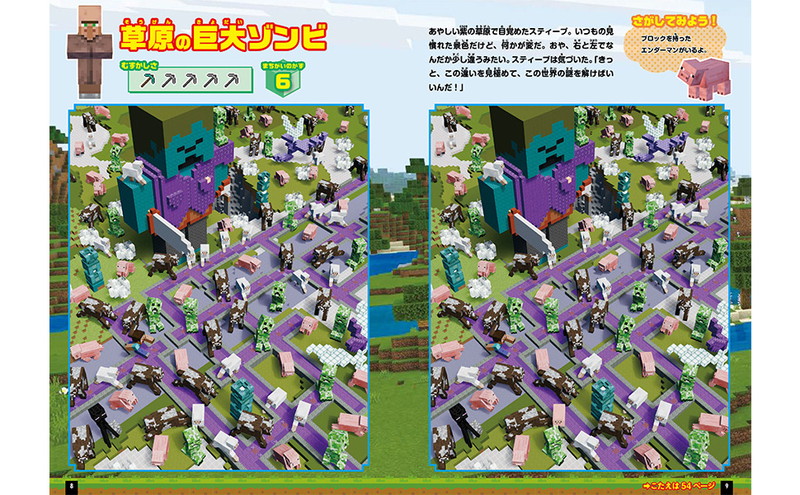 今回もゾンビ、クリーパー、エンダードラゴンなどおなじみの人気モブたちが大暴れ! じっくり観察してまちがいを見つけ出しましょう。