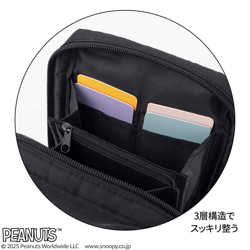 ポケットが深めなのもうれしいポイントです。メインの収納スペースはダブルジップ仕様。3層構造でガバッと開くから物を取り出しやすく、内側にはICカードやクレジットカードが入る4つのポケットを装備。カード類もすっきり収納ができます。