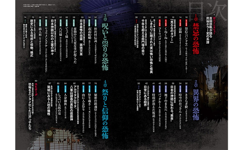 各地に根付く因習・怪異の恐怖は、SNSや怪談師たちを通じて現代のいたるところで不気味な魅力を放っています。本誌では「八尺様」や「コトリバコ」に代表される怪異譚のとっておきを紹介しながら、それらのルーツとなった実在の奇習や民間信仰をひもときます。今や一大ジャンルとなった「民俗ホラー」のさらなる深みへ。