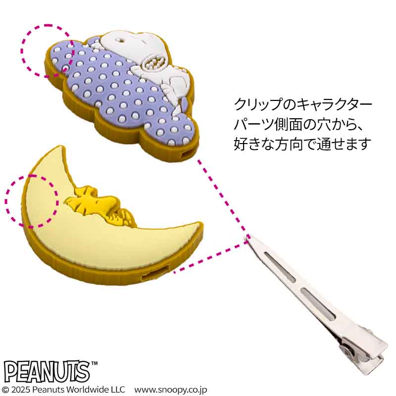 前髪クリップはキャラクターパーツ側面の穴からクリップを好きな方向で通せるので、使いたい向きに合わせられ、キャラクターが逆さになってしまうことがありません。おうちでのリラックスタイムはもちろん、外出時のヘアアレンジに使ってもかわいいヘアクリップセットです♪