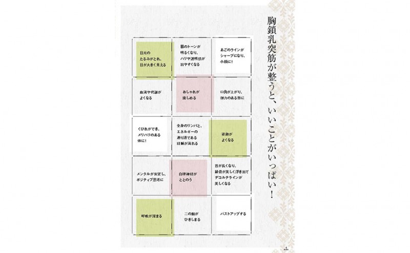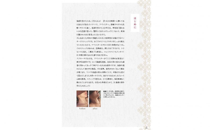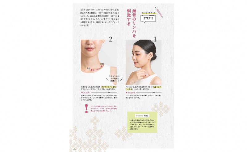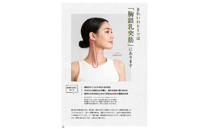 インスタグラムなどでも最近さらに話題になっている胸鎖乳突筋マッサージ。首にある筋肉の胸鎖乳突筋を揉むことで小顔になりシミやシワも消えるといいます。開きやすい中綴じの大きめサイズでマッサージの手順がわかりやすく、首を押しやすいローズクオーツのマッサージスティックが付いています。