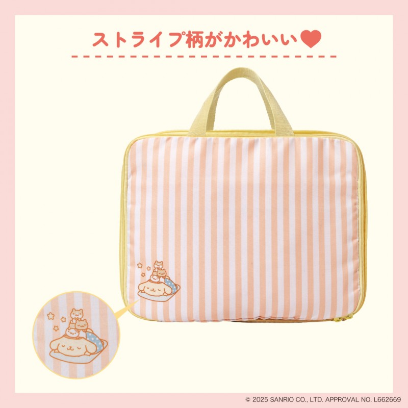 ポムポムプリンのイラストをあしらった圧縮収納ポーチは、衣類や小物を収納してファスナーを閉めるだけでかんたんに圧縮できる収納ポーチです。