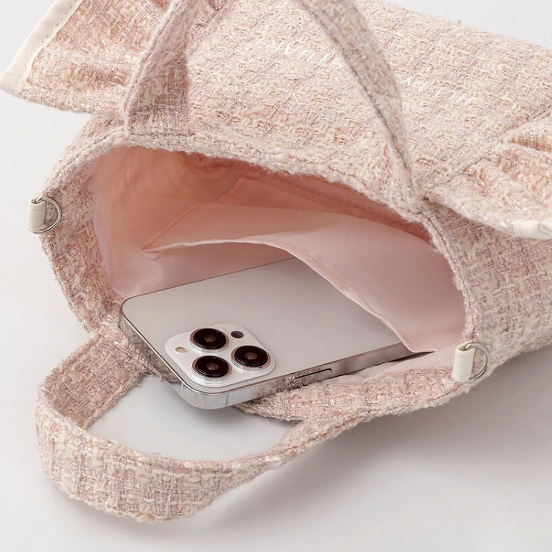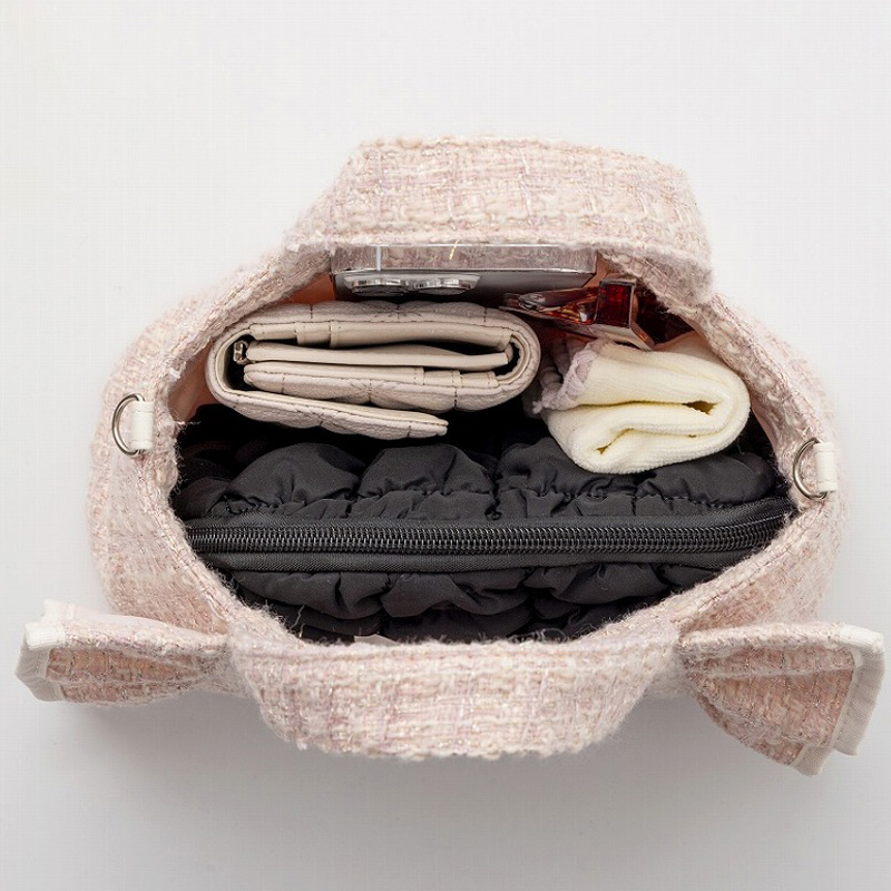 ピンクツイードが上品なバッグは、デイリー使いにちょうどいいサイズ。