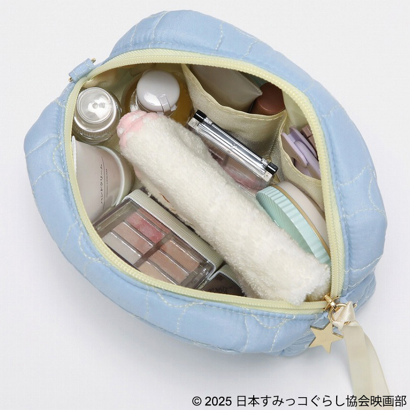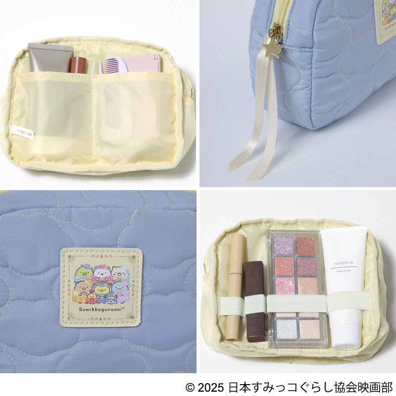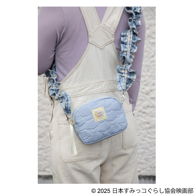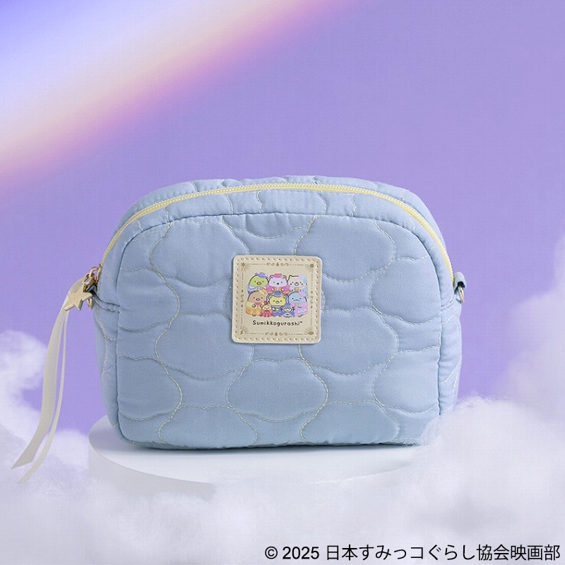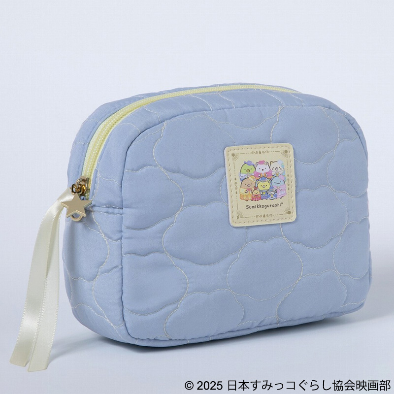 冒険の舞台・空の王国にちなんだ雲柄のキルティング生地に映画版の衣装を着たすみっコたちのタグをオン。