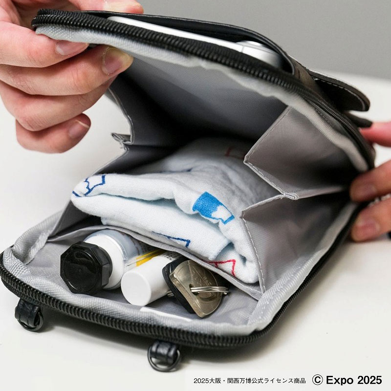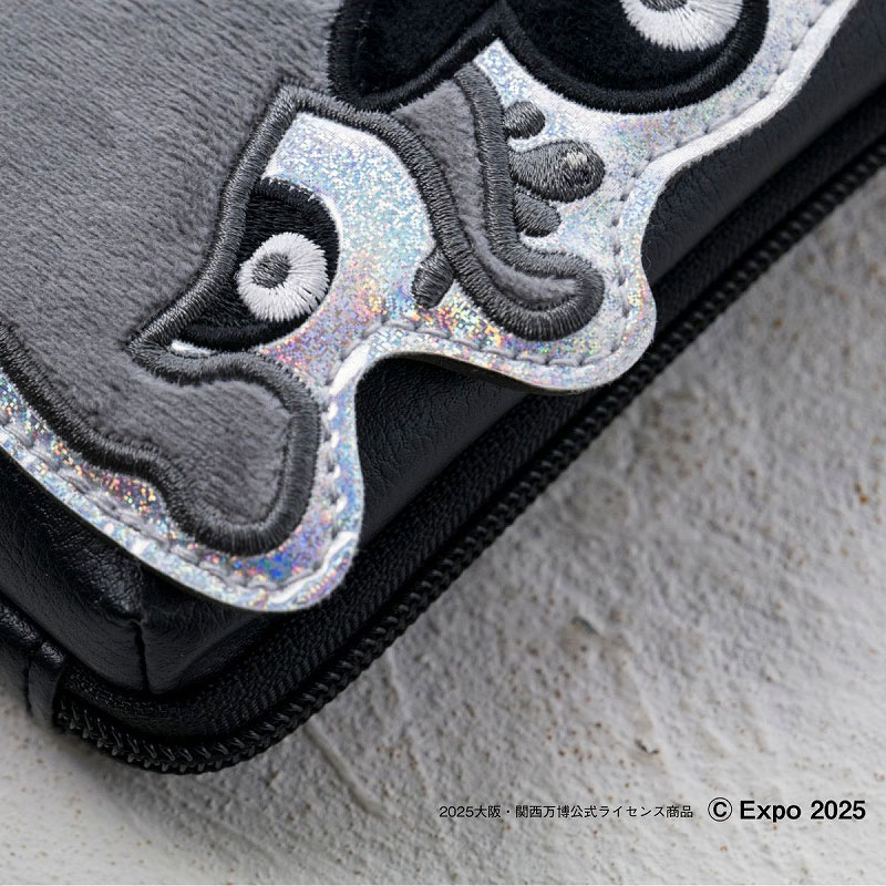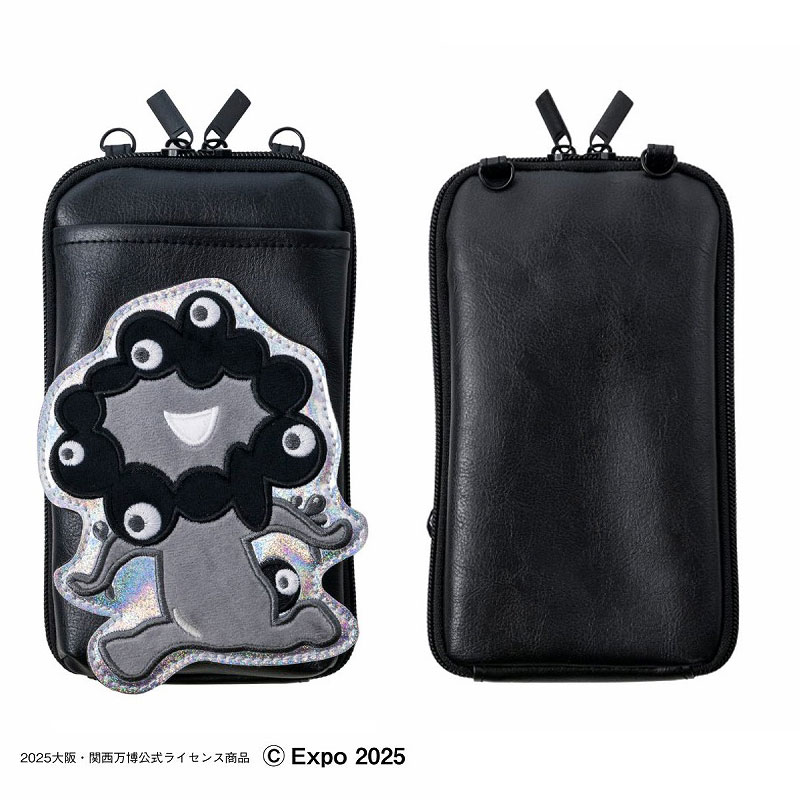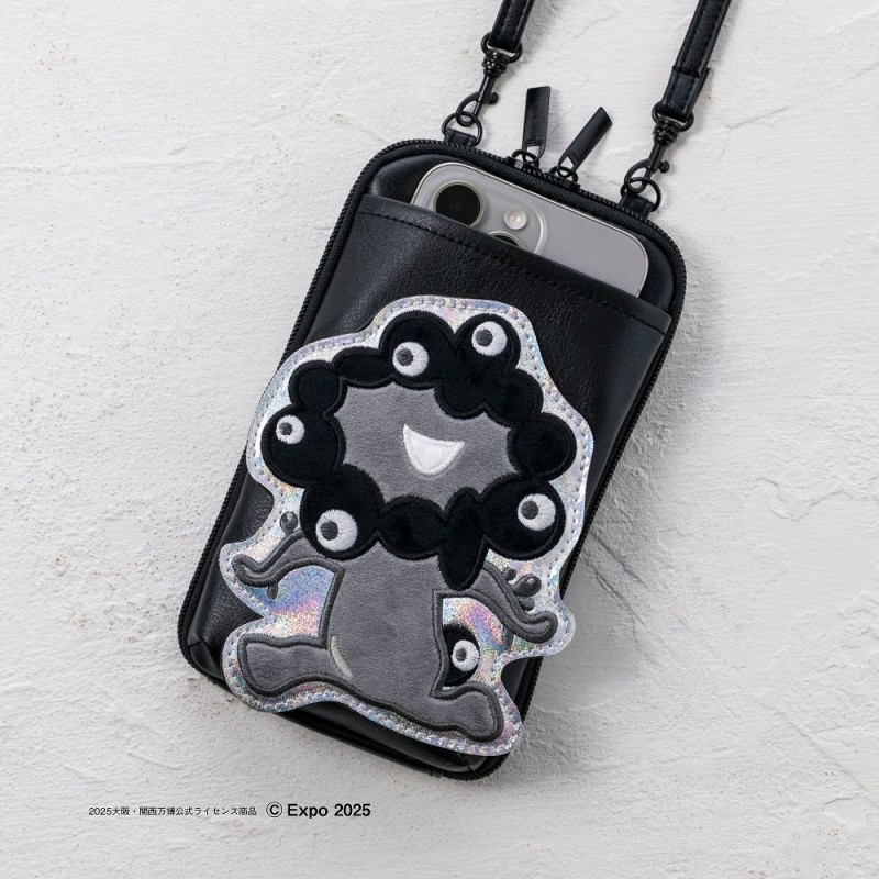 ファスナーも金具もすべて真っ黒のクールなスマホポシェットで、シルバーのキラキラ生地に映える「黒ミャクミャク」が目を引きます。