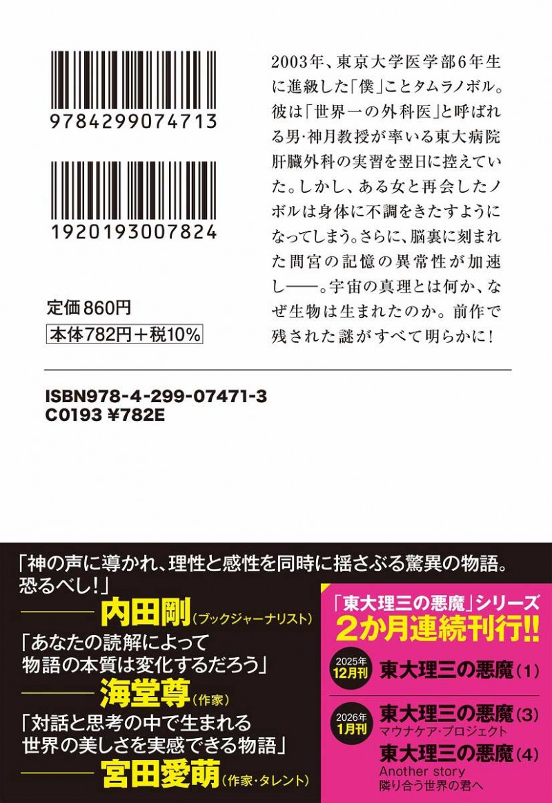 東京大学医学部6年生のノボルは、「世界一の外科医」と呼ばれる男・神月教授が率いる名門医学教室、東大病院肝臓外科の実習を控えていた。そんなとき、ノボルが5年間恐れていたことが現実となり――。宇宙の真理とは何か、なぜ生物は生まれたのか? 前作『東大理三の悪魔』で残された謎がすべて明らかに!