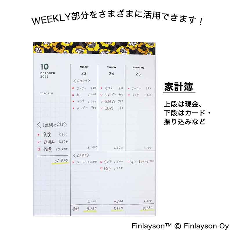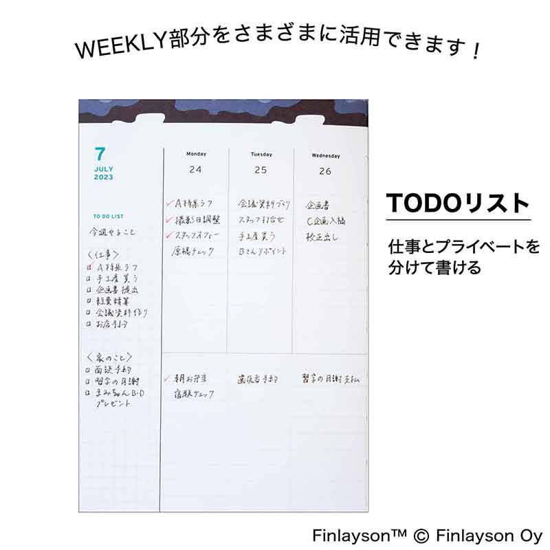 さらに開くと、登場するのは2023~2024年の年間カレンダー。こちらのページの上部にも、フィンレイソンの柄がプリントされています。鳥が好きな「宝島チャンネル」なかの人としては、うきうきしちゃうようなデザインです。