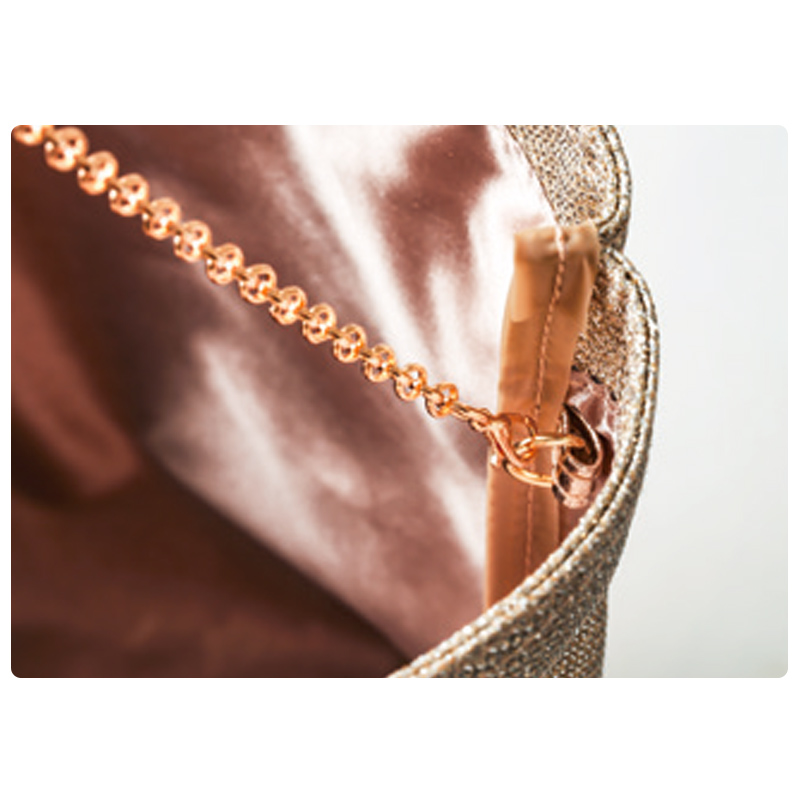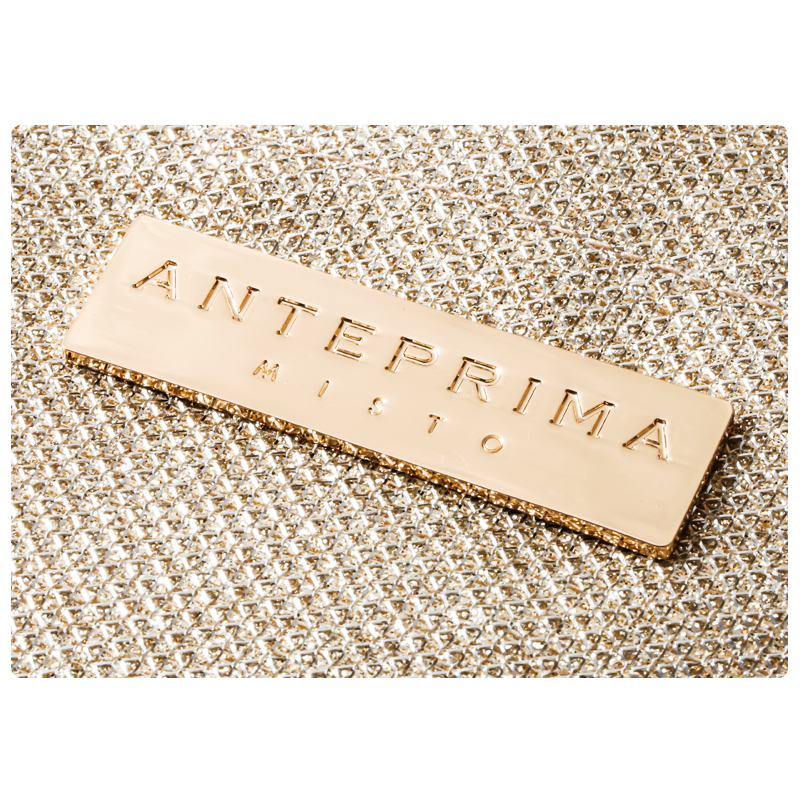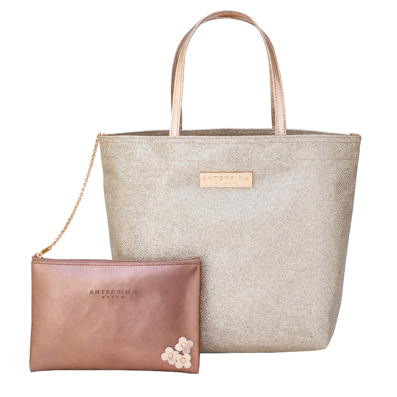 トートは繊細な輝きのラメ生地に、ピンクゴールドのロゴプレートをオン。