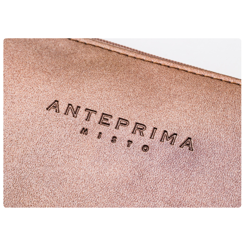 ポーチは、落ち着いたブロンズ色のレザー調生地に、ロゴを刻印。