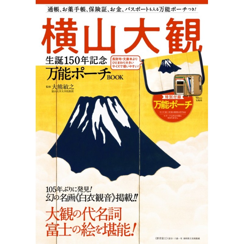 日本画の大家、横山大観の生誕150周年を記念した万能ポーチ付きムックです。ポーチの柄は代表作でもある『群青富士』。モダンな柄は年齢も性別も選ばず使えるので自分用はもちろん、プレゼントとしても喜ばれます!本誌では、大観が描き続けてきた富士山をメインに紹介。代表作と万能ポーチで大観を堪能できます!
