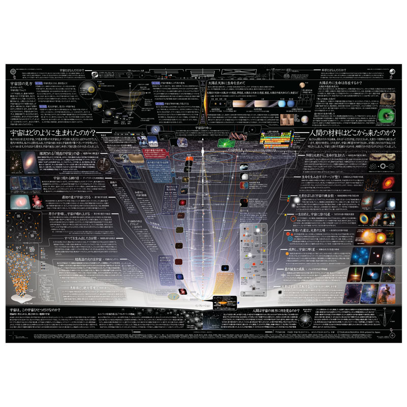 宇宙でいまわかっていることを、一枚の平面図に表し、その時間(歴史)と空間(広がり)を説明した概念図が「宇宙図」です。その制作に当たった宇宙図制作委員会が宇宙の成り立ちから不思議まで、いま判明していることを徹底的に解説します。A2サイズの「宇宙図ポスター」付き。