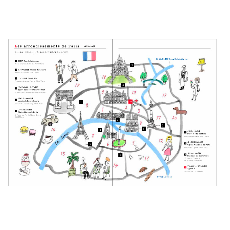 ノートや切り取って使えるメモなど実用性抜群! アニエスベーのメッセージやイラストレーターによる描きおろしパリ区地図、パリで使えるお役立ちフレーズ集なども収録。
