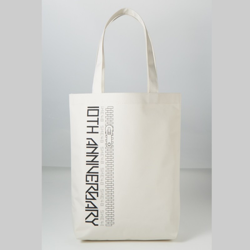 AKB48グループの衣装を手がけるオサレカンパニーのデザインによる10thアニバーサリー・オリジナルトートバッグは、コンサートやイベントなどでも使いやすいマチありA4サイズです。