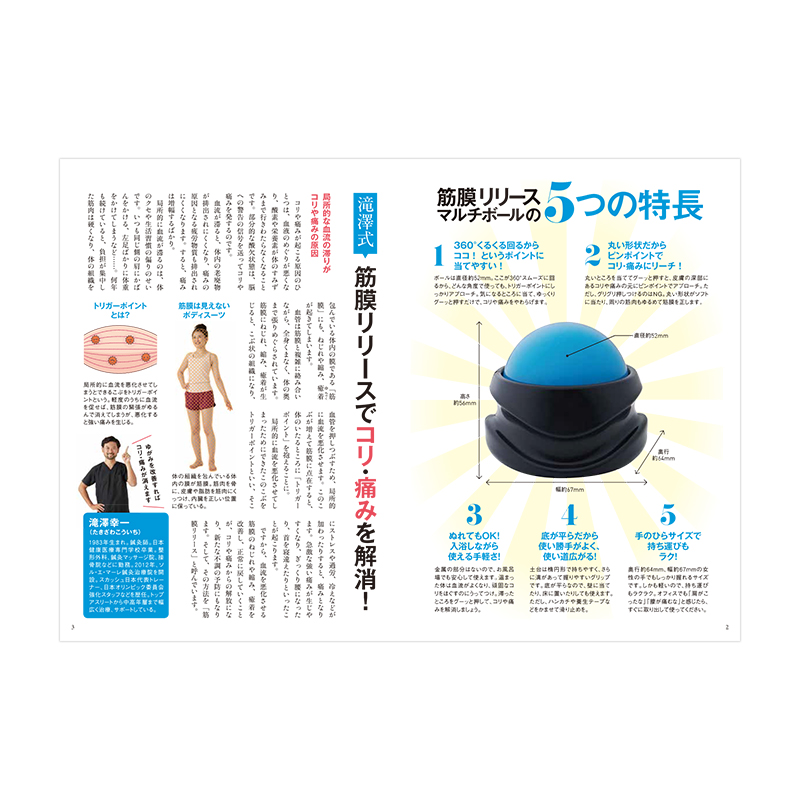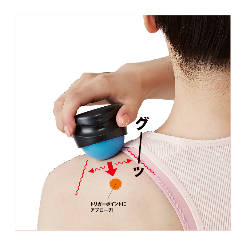 肩コリ、首コリ、腰痛や背中の痛みにいつも悩まされていませんか?体の組織を包み込む「筋膜」にゆがみが生じてできるこぶ(トリガーポイント)がその不調の原因。こぶによって部分的に血流が滞り、痛みとコリの原因となってしまうのです。この筋膜のゆがみとこぶを改善し、正常な状態へと戻していく治療法が「筋膜リリース」です。本誌付録の「筋膜リリースマルチボール」は、誰でも簡単に体の深部にできたトリガーポイントをほぐし、筋膜リリースができるサイズに設計しました。手のひらに収まる大きさで持ち運びも楽なので、オフィスでも、自宅でも、バスルームでも、いつでも手軽にコリを解消できるマッサージアイテムです。