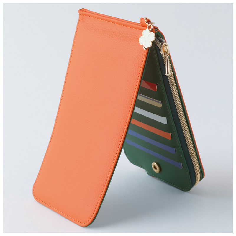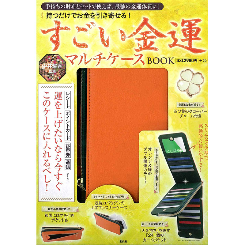金運を上げたい人の必需品!1万5千人以上の運命を変えた超人気占い師、中井耀香先生監修の“究極の金運マルチケース”が完成しました!あなたのお財布は、レシートやポイントカード等でパンパンになっていませんか?お財布の中は現金とキャッシュカードなど、お金に準ずる最小限のものにしぼり、常にスッキリさせておきましょう。それ以外のものは、この金運マルチケースに収納を!タテ型で大量のカードを見やすく整理でき、中央のL字ファスナー部分にはレシートから通帳、スマホまですっぽり。後面にもマチつきポケットがあり、鍵などを入れても◎。デザインは高級感のあるレザー調の生地で、色は上品なオレンジ色。幸福と金運を呼び込む、オリジナルのクローバーチャームつきです。