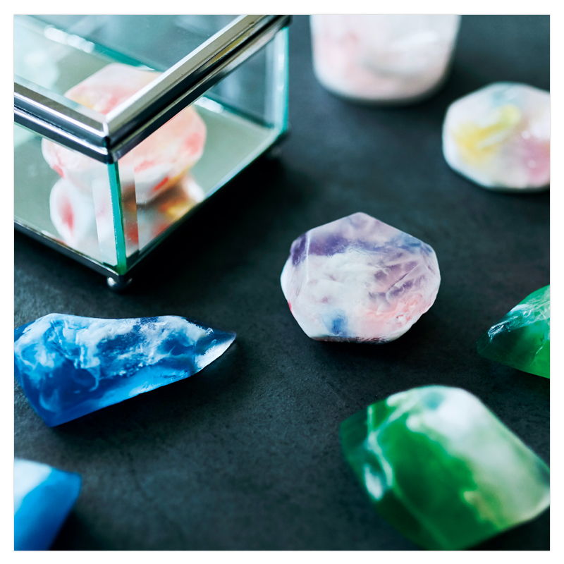 「キレイすぎる!」と日本でも話題の「宝石せっけん」の手作りキットが登場。作り方はとっても簡単。付属のせっけんの素を、電子レンジで溶かして混ぜるだけ。キットには、ベースとなる透明せっけん200gと、赤・青・黄・白4色の色せっけんがセットに。約2~3個の宝石せっけんを作ることができます。誌面では基本の作り方やアレンジ方法をはじめ、8種類の宝石せっけんのレシピを掲載。 誰でも気軽に本物の宝石のようなせっけんを楽しめる一冊が誕生しました。ぜひ世界でひとつだけの輝きをお楽しみください。