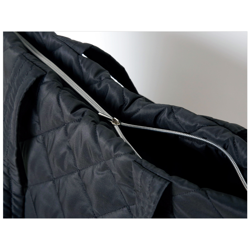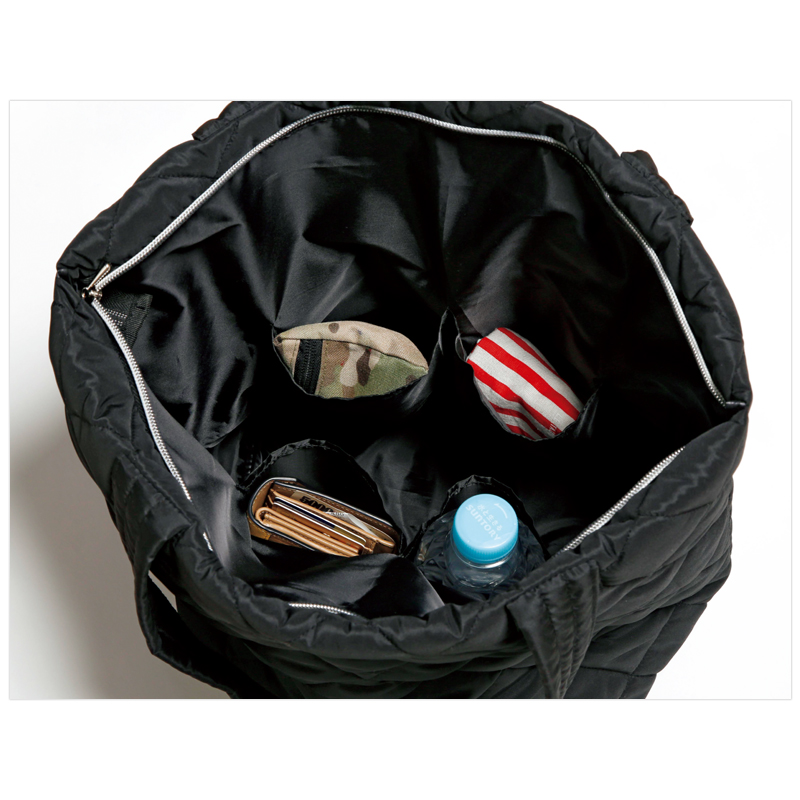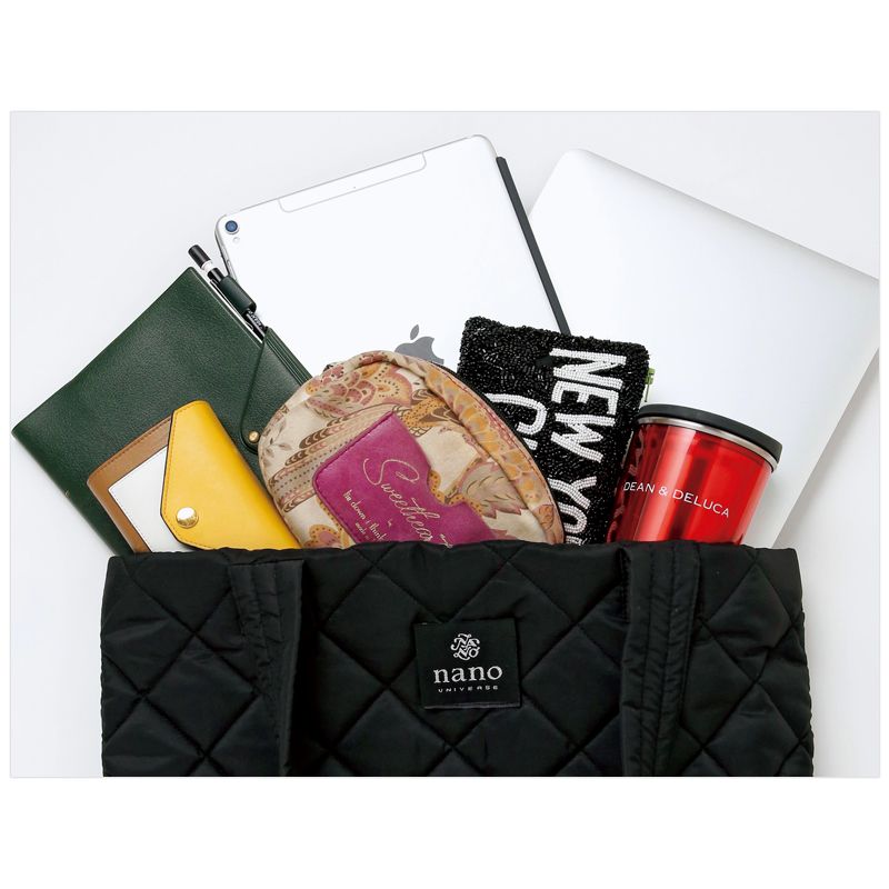 約160gの超軽量!B4サイズも入る大容量!スタイリッシュで、マザーズバッグとしても大活躍。内ポケットも多くて使いやすさバツグンのキルティングトートバッグです。シンプルなデザインの黒のバッグなので、さまざまなコーディネートと合わせやすいのも魅力。口はファスナーで開閉できるので荷物が多い人も安心です。誌面ではナノ・ユニバースの最新スタイルを、人気モデルの宮田聡子さんが着こなします。