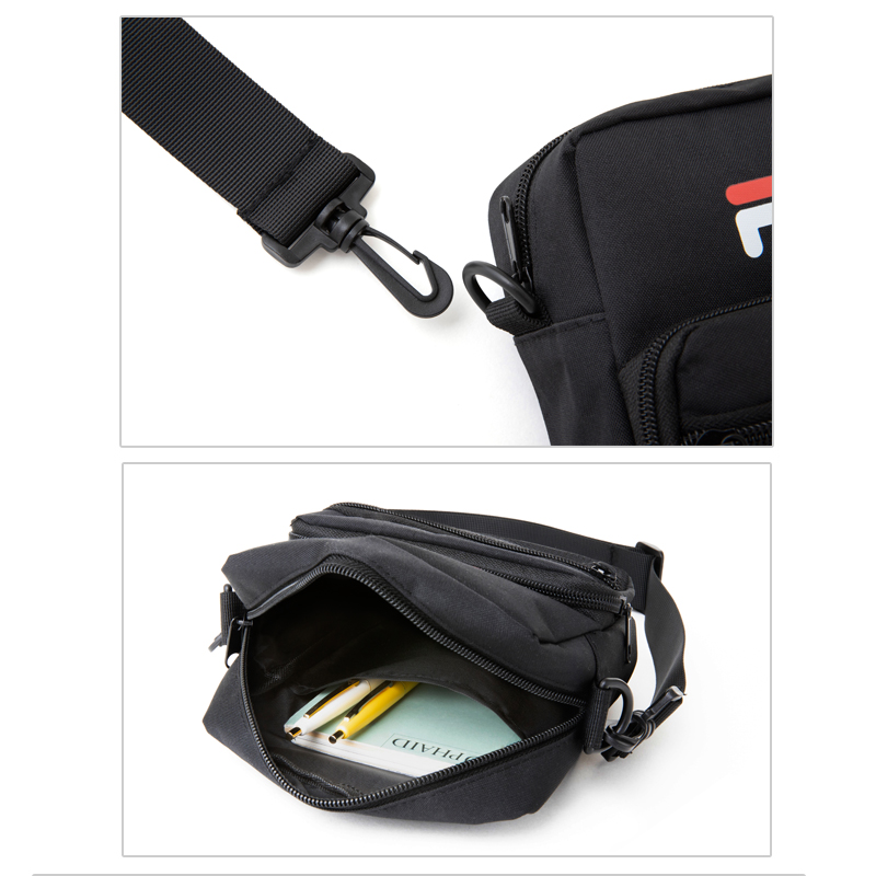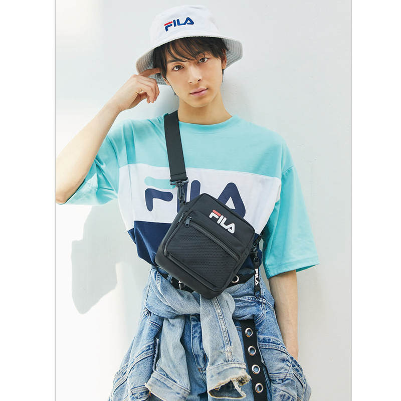 メッシュ付き立体ポケットとFILAのロゴテープが