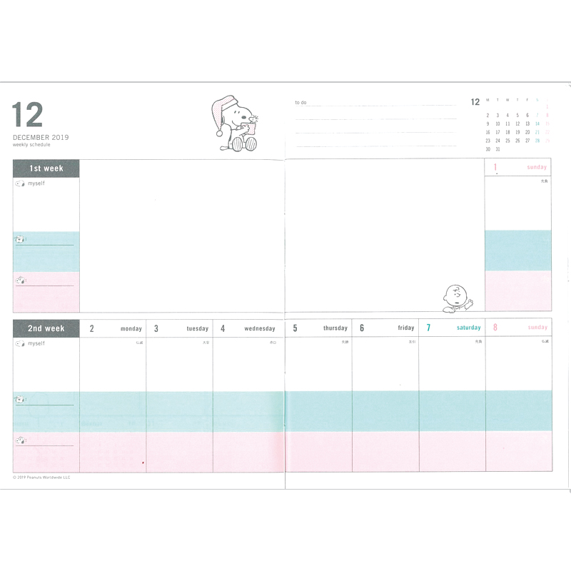 2019年10月~2021年3月のマンスリーカレンダー & 2019年12月~2020年12月のウィークリースケジュールを収録。