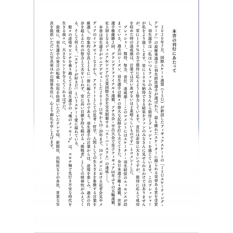 過去10シーズンにおける記者会見やインタビューから、「アスリート・羽生結弦」の思考や哲学、「人間・羽生結弦」の生きざまを象徴する言葉を厳選し、カメラマン能登直氏が撮影した印象的な写真とともに紹介。人生に勇気を与えてくれる珠玉の言葉が満載。全国のファンからアスリート、そして勇気を授かりたい人まで。ぜひ読んでほしい名言+ビジュアルブックです。