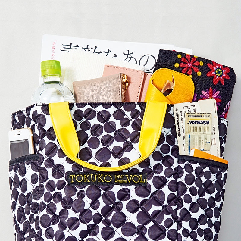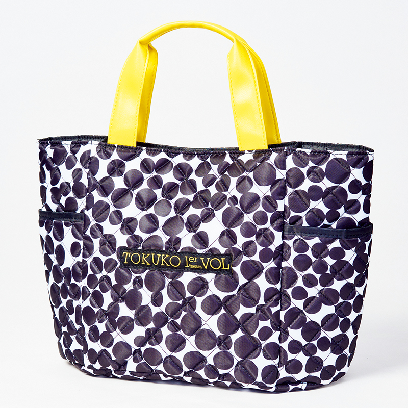 レザー調ハンドルのイエローを差し色に、コーディネートしやすいドット柄。