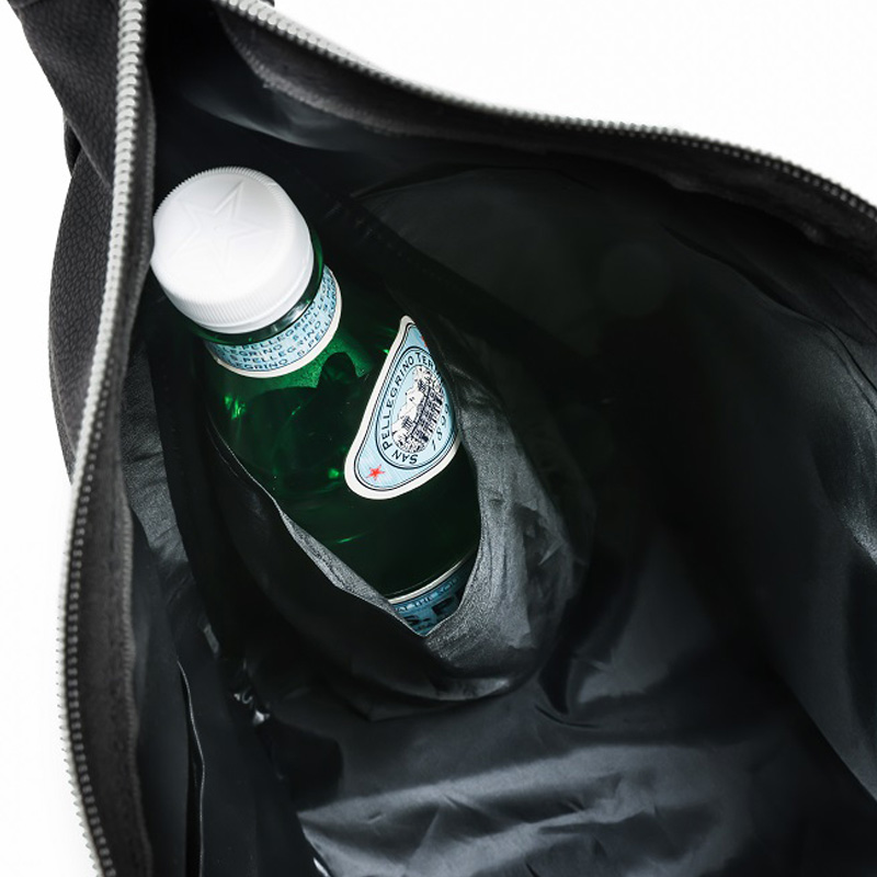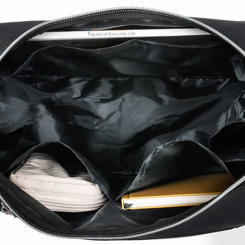 雑誌やA4サイズの書類が入るのはもちろん、マチがたっぷりで通勤・通学や一泊旅行にも使えそうな大容量。太めのショルダーストラップは荷物をたくさん入れても肩に負担がかかりにくいのが◎。さらにソフトレザー調の素材で、軽いのにきちんと見えるところもポイントです。内側にはポケットが3つと、ペットボトルホルダーもついています。