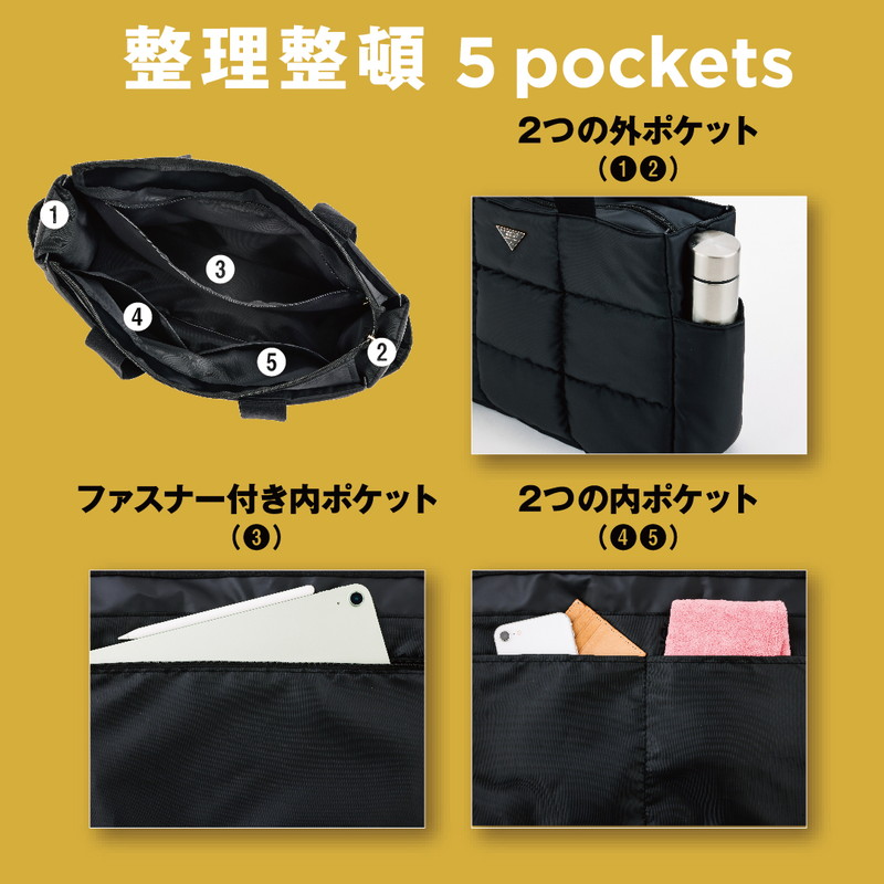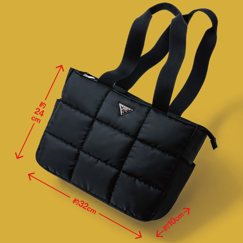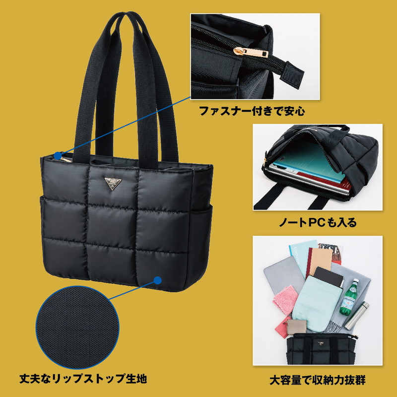 リップストップ生地でふかふかのキルティング仕様のトートバッグ。A4サイズが入る大きさでオフィス、デイリー、レジャーとシーンを選ばず大活躍間違いなしです。また軽量で大きく整理整頓ができるので、マザーズバッグとしてもおすすめです。