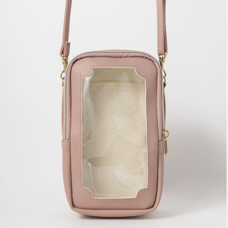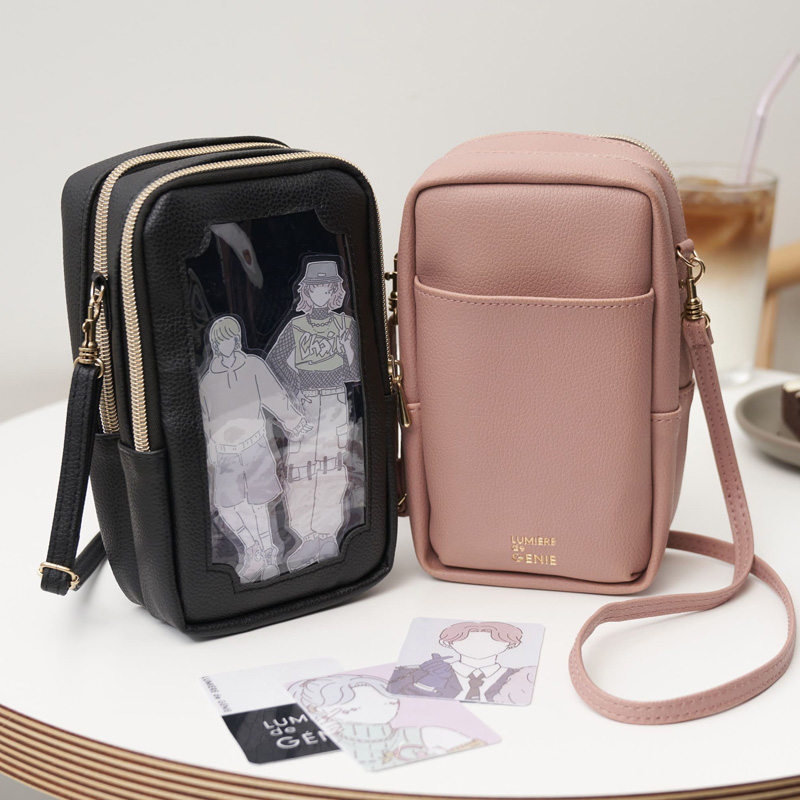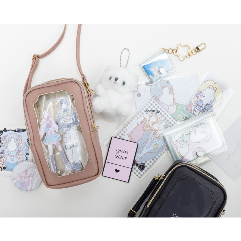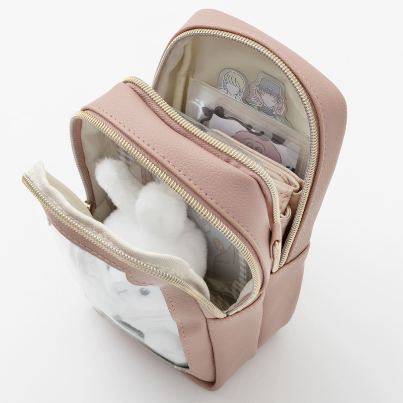 便利な2層構造+外ポケット。外側のポケットにはスマートフォン、真ん中にはお財布やリップなどの必需品やトレカを、クリアポケットにはアクスタやぬいぐるみを収納可能。