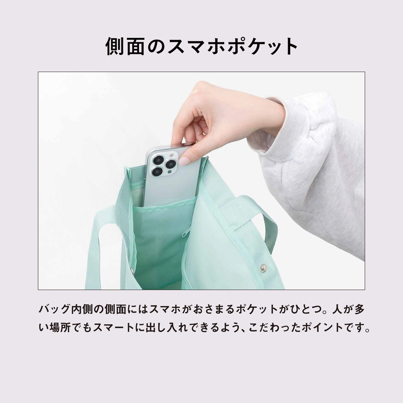 バッグ内側の側面にはスマホがおさまるポケットがひとつ。人が多い場所でもスマートに出し入れできるよう、こだわったポイントです。